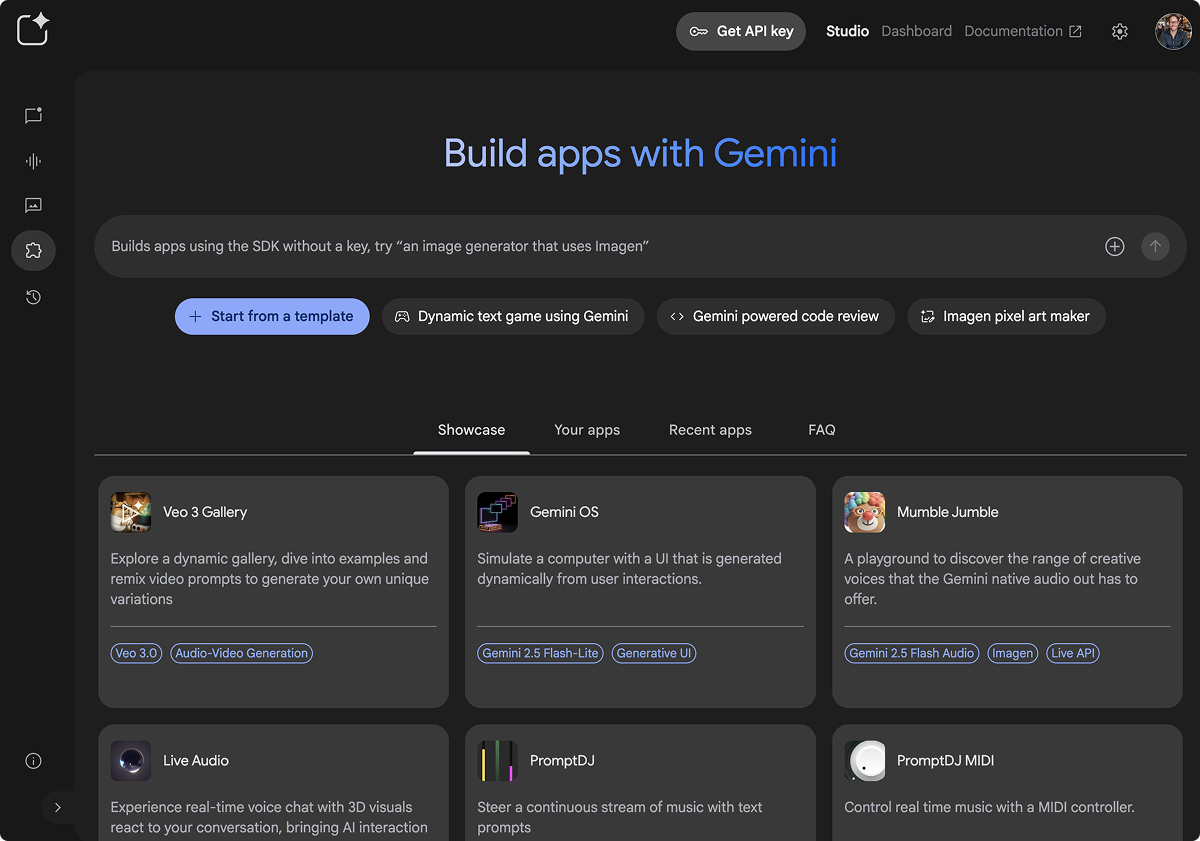 Google AI Studio is the fastest place to start building with the Gemini API, with access to our most capable models, including Gemini 2.5 preview models, and generative media models like Imagen, Lyria RealTime, and Veo. At Google I/O, we announced new features to help you build and deploy complete applications, new model capabilities, and new features in the Google Gen AI SDK.