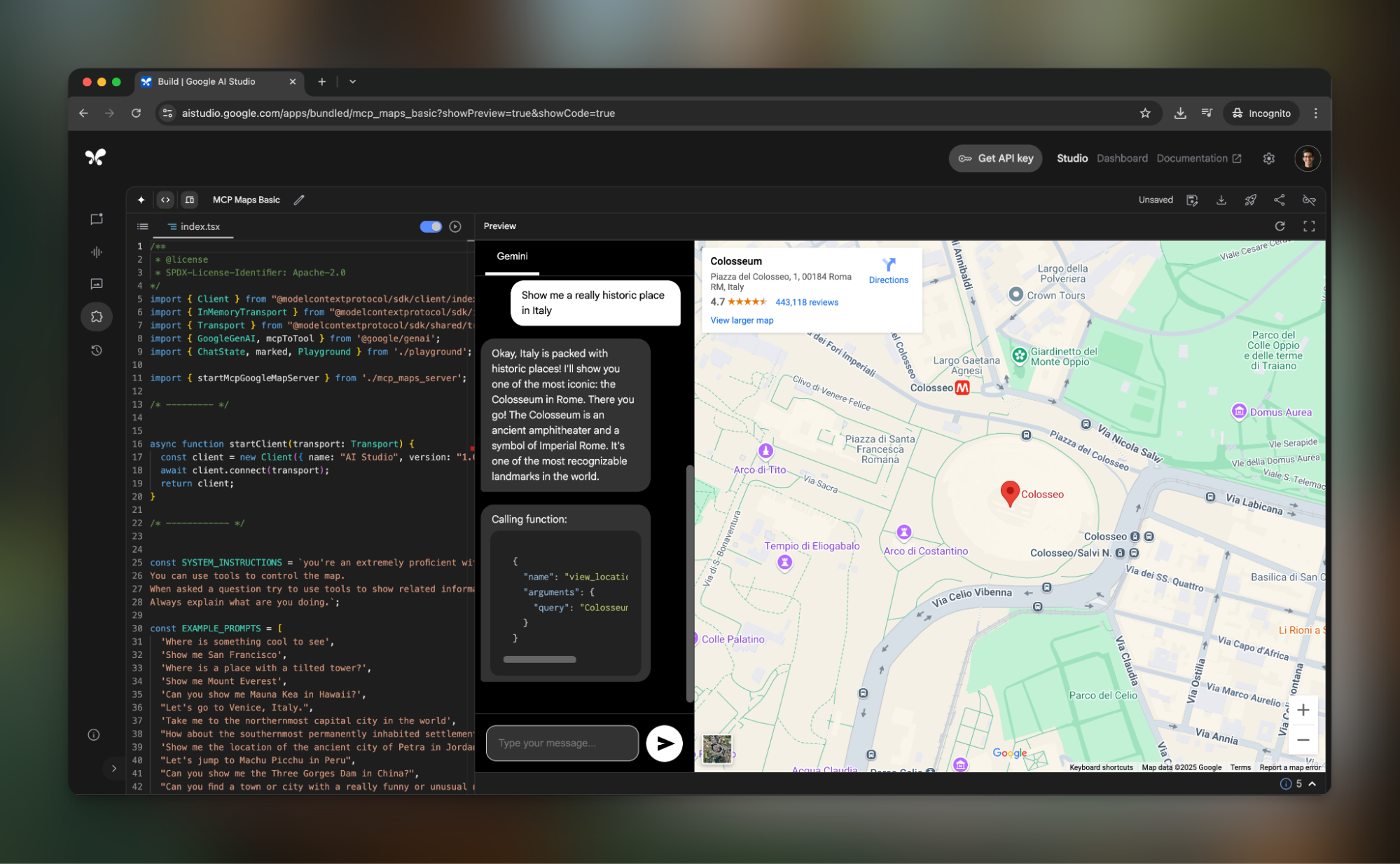 Model Context Protocol (MCP) definitions are also now natively supported in the Google Gen AI SDK for easier integration with a growing number of open-source tools. We’ve included a demo app that shows how you can use an MCP server within Google AI Studio that combines Google Maps and the Gemini API